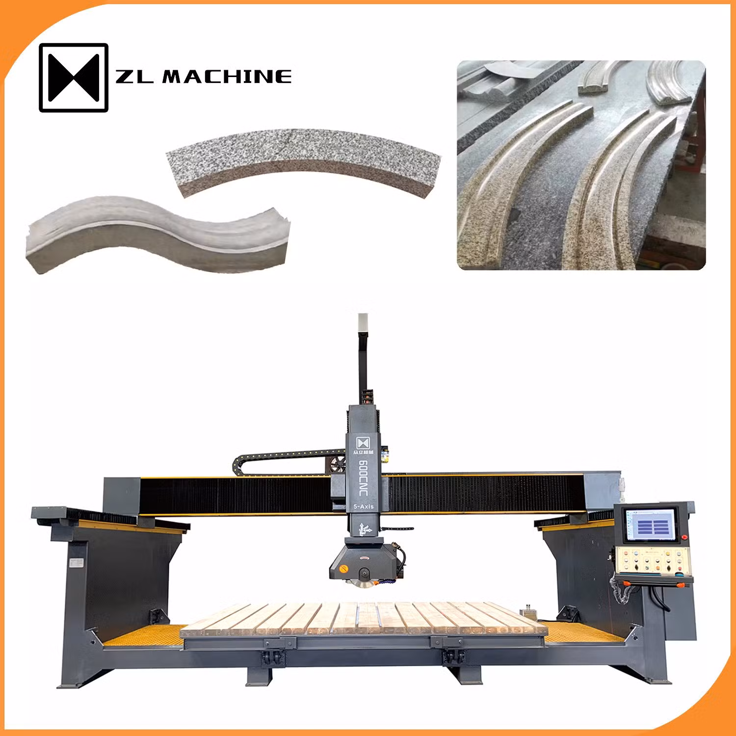 Suministramos sierras de puente CNC de 5 ejes, tipo ZLBS-600CNC/5A 5 ejes máquina de corte inteligente para el procesamiento de cuarzo, mármol y granito. Es de alta eficiencia, alta precisión, fácil y fácil de manejar. Tome una foto, ponga el dibujo en la piedra en la foto, y luego arranque la máquina, que se procesará. La parte principal del tipo ZLBS-600CNC/5A puede ser puesta en un contenedor de cubo alto de la parte superior abierta.